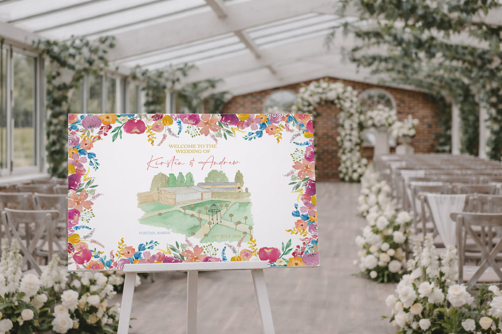 Decorated wedding venue with a floral-themed welcome sign on an easel.