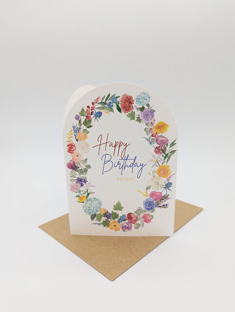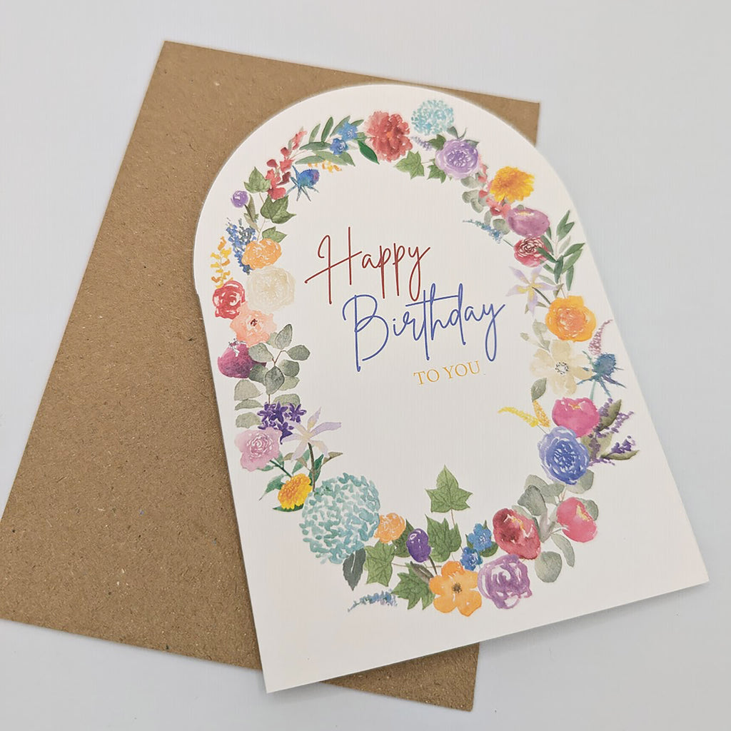 A lovely colourful and floral birthday card. Arched top shape for a unique card with an oval wreath of British colourful flowers painted by Hannah with the words Happy Birthyda to you in the middle